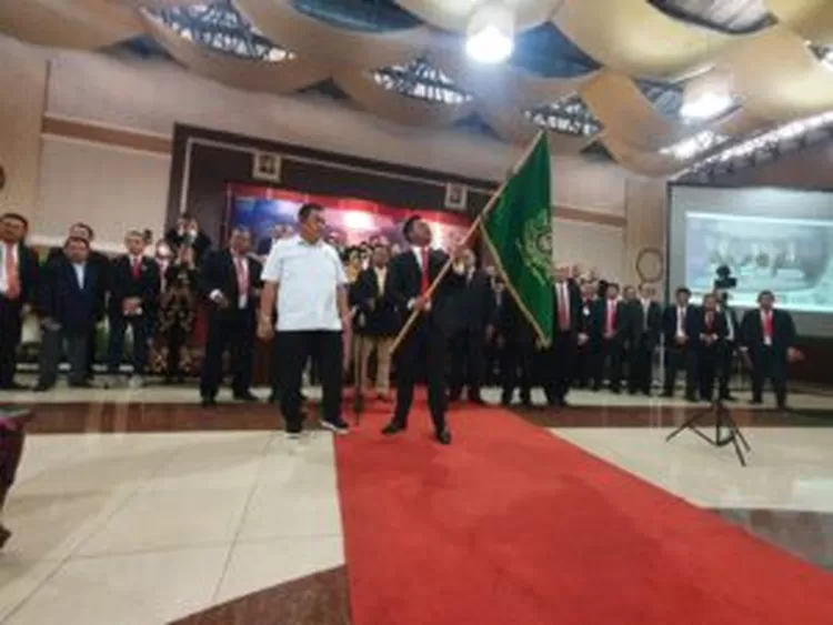 KIBARKAN PANJI : Disaksikan Ketua KADIN JAWA Barat, Cucu Sutara, dewan kehormatan dan pengurus, Ketua KADIN Kota Depok, Miftah Sunandar mengibarkan panji KADIN usai dilantik di Hotel Bumi Wiyata, Jalan Raya Margonda, Kecamatan Beji, Kota Depok, Jumat (26/08).