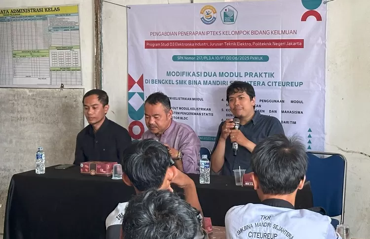 PkM D3 Elektronika Industri (D3 EI) meningkatkan wawasan bidang ilmu bagi SMK Bina Mandiri Sejahtera (BMS), Citeureup, Bogor sebagai obyek pelaksanaan PkM D3 EI, Jurusan Teknik Elektro (JTE), Politeknik Negeri Jakarta (PNJ). (ISTIMEWA)